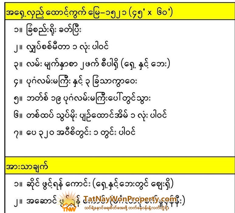 ၁၅၂၁ အောင်သပြေလမ်း ၁၂ ရပ်ကွက် ရွှေပေါက္ကံ (၄၅×၆၀) ထောင့်ကွက် ရှေ့လှည့် (၂,၁၅၀သိန်း - ညှိနှိုင်း)
